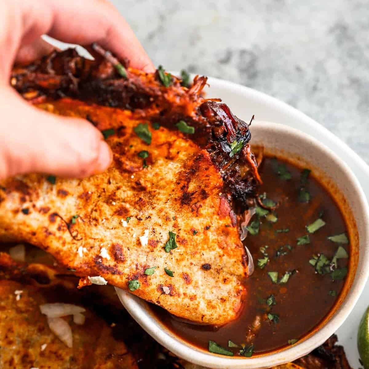 Slow-braised beef, melted cheese, consommé dip.